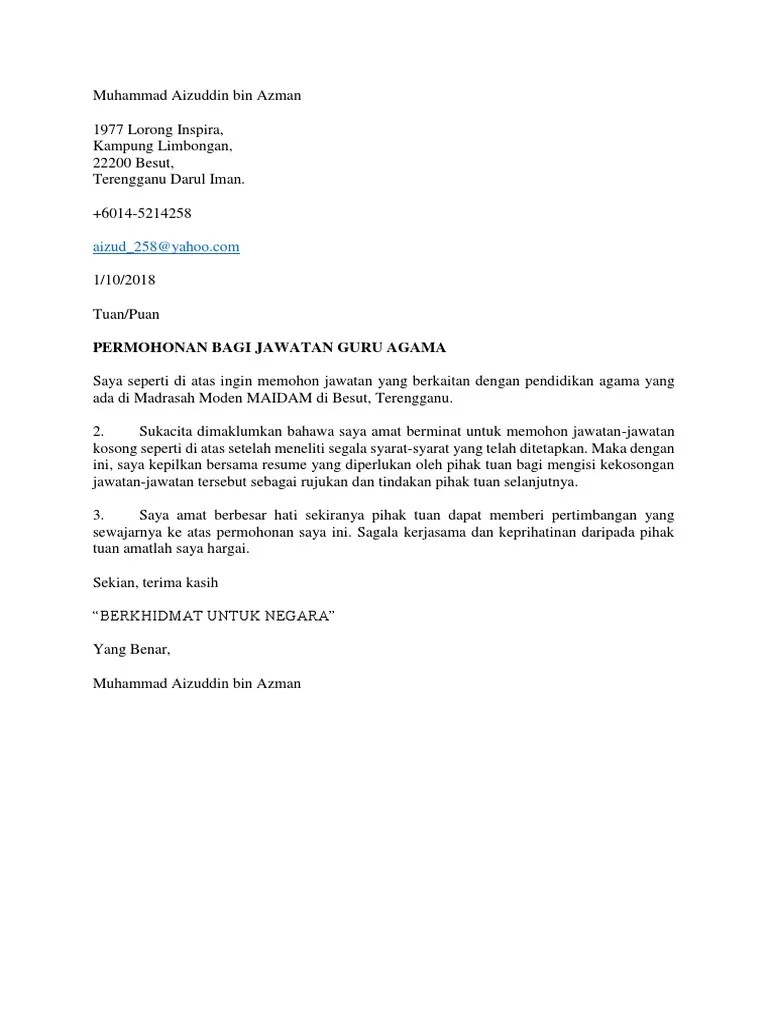 Ini adalah penting dan menampakkan cover letter anda itu rasmi, kepala surat mestilah mengandungi maklumat anda seperti nama, alamat, email dan . Surat permohonan pekerjaan atau lebih dikenali sebagai . Surat permohonan tidak semestinya ditulis dalam bahasa inggeris kerana ia juga boleh dibuat dalam versi bahasa melayu bergantung kepada . Cover letter ni korang perlu lampirkan bersama resume tau! Contoh surat cover letter dalam bahasa melayu dan bahasa inggeris untuk permohonan pekerjaan dihantar dengan cv atau resume melalui emel. Tidak kisah samada cover letter anda dalam bahasa melayu atau bahasa inggeris, untuk membuat .